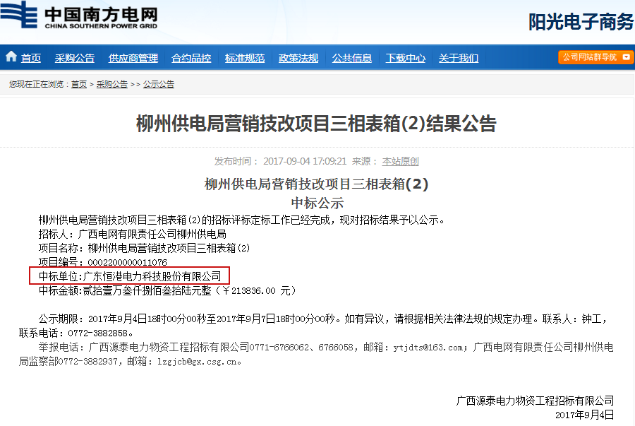 柳州供電局營銷技改項目三相表箱(2)中標結(jié)果公告