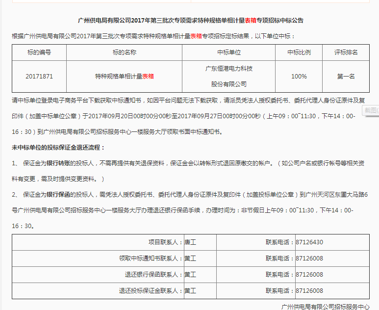 廣州供電局有限公司2017年第三批次專項需求特種規格單相計量表箱專項招標中標公告