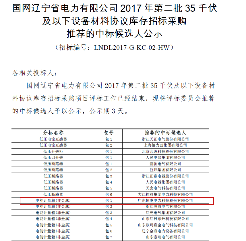國網遼寧省電力有限公司2017年第二批35千伏及以下設備材料協議庫存招標采購中標候選人公示