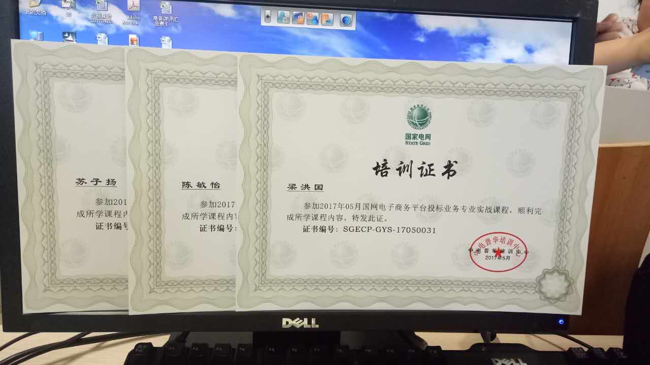 恭喜我司在參加2017年5月國網電子商務平臺投標業務專業實戰課程獲得優秀學員獎,這一期共有52位學員參與,只有三個優秀學員名額,我司員工是其中一位