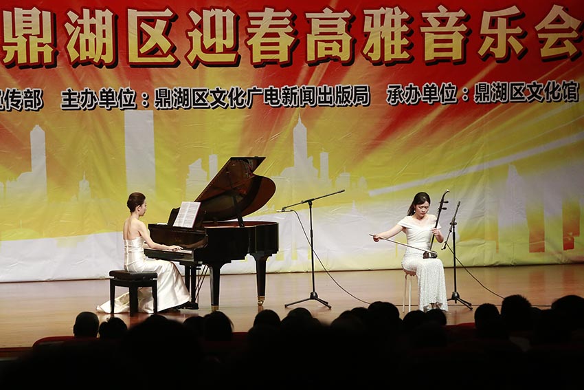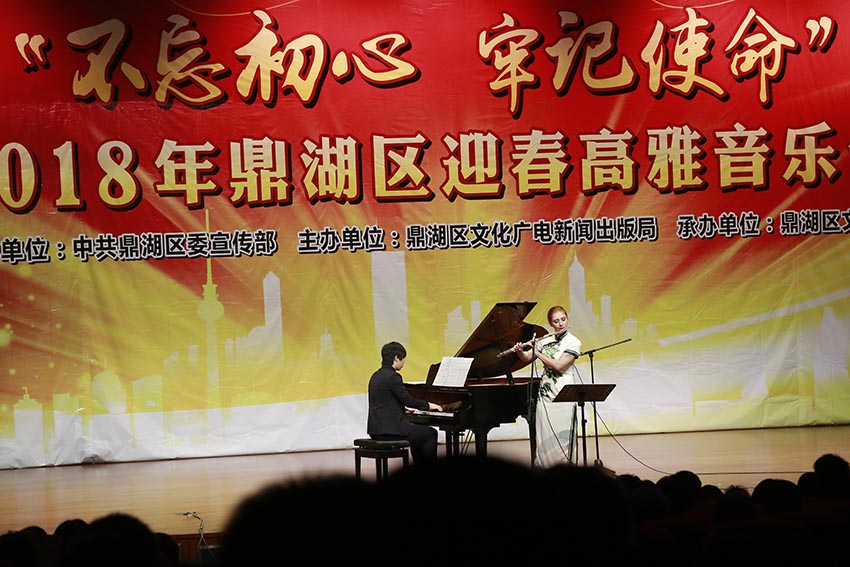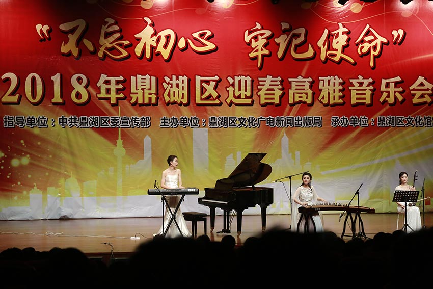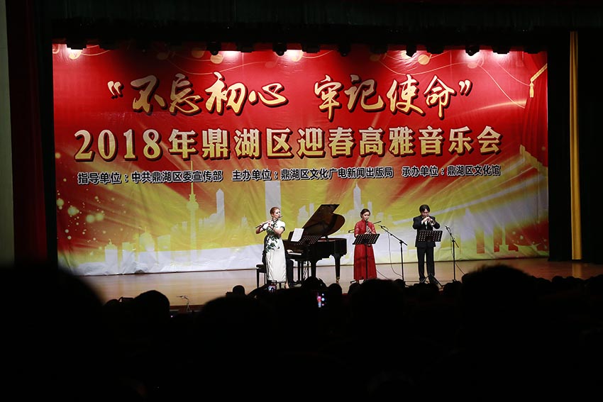 演藝中心華燈璀璨,文化舞臺音韻悠揚,2018年1月18日晚,由鼎湖區委宣傳部指導、區文廣新局主辦的“不忘初心 牢記使命”2018鼎湖區迎新年高雅音樂會在區演藝中心隆重上演。音樂會在悠揚、悅耳的《苗嶺的早晨》中拉開帷幕。經典樂曲《梁祝》《茉莉花》等樂曲讓眾人深情抒發回到靈魂深處的情懷,耳熟能詳的流行樂曲《卷珠簾》改編成鋼琴曲則拉近了觀眾與演奏者的距離,令觀眾產生情感共鳴,贏得滿堂掌聲。最后,晚會在四人合奏經典名曲《茉莉花》中完美落幕。