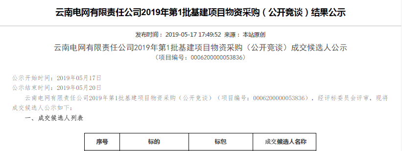 熱烈祝賀我司在云南電網(wǎng)有限責任公司2019年第1批基建項目物資采購(公開競談)中標