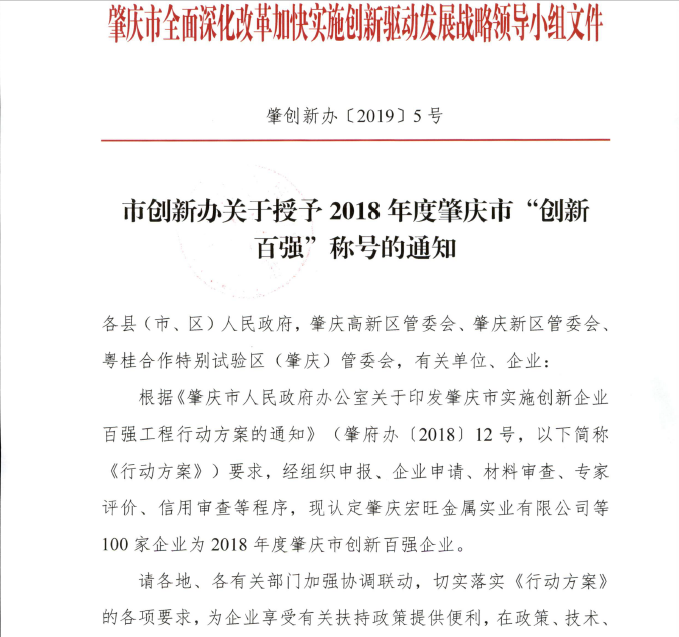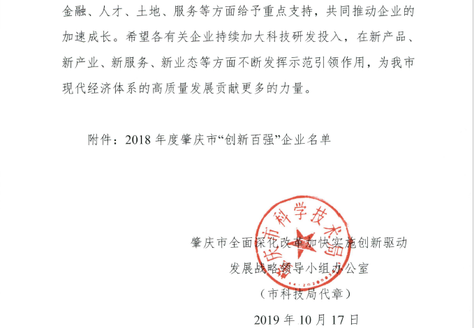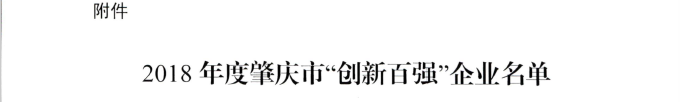 熱烈慶祝我司榮獲2018年度肇慶市“創新百強”稱號