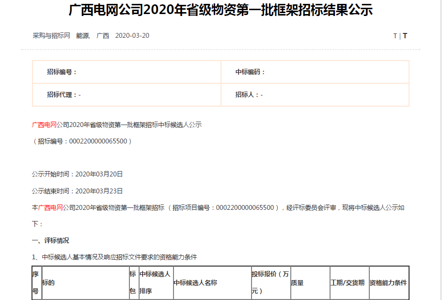 熱烈祝賀我司在廣西電網(wǎng)公司2020年省級物資第一批框架招標(biāo)中標(biāo)