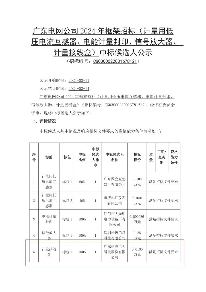奮力拼搏創(chuàng)佳績,喜奪龍年開門紅。2024年3月2日,南方電網(wǎng)供應(yīng)鏈統(tǒng)一服務(wù)平臺中標結(jié)果公示,我司成功中標“廣東電網(wǎng)公司 2024 年框架招標(計量用低壓電流互感器、電能計量封印、信號放大器、計量接線盒)”項目“接線盒”標段。成功中標,離不開恒港人的努力和汗水。讓我們繼續(xù)攜手共進,再奪佳績!