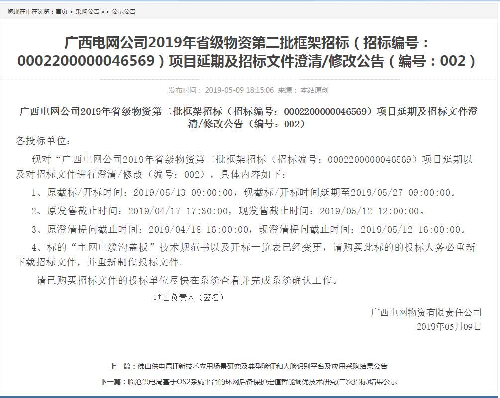 廣西電網公司2019年省級物資第二批框架招標(招標編號:0002200000046569)項目延期及招標文件澄清/修改公告(編號:002)