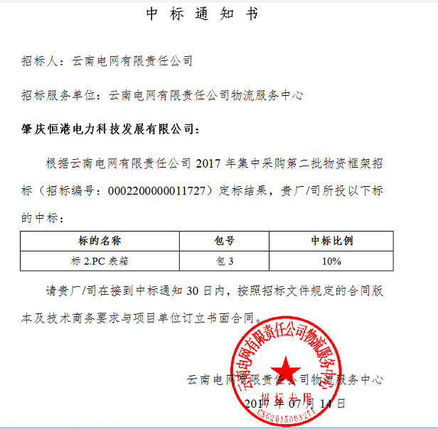 云南電網有限責任公司2017年集中采購第二批物資框架招標結果公告